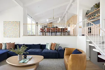 This architectural gem was a well-cared for home when Kirby Kelly stepped in to refresh the home for a new generation. It was designed by Ron Molen of Salt Lake City Mid-Century Modern fame. We opened up the main living space to the kitchen for a truly impressive great room feeling. The soaring ceilings add to the drama of the space. Focal points beyond the gorgeously appointed kitchen are the black zellige tile fireplace and the dramatic lighting.